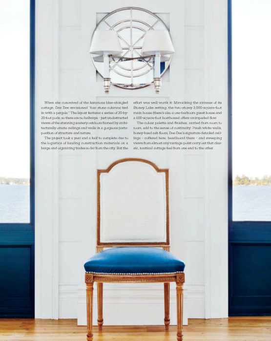At this point, I feel like I should probably just accept the fact that I have grown to be a fan of the color blue. It has never been my favorite color, but over the past year or so, I have come to really love deep cobalt, navy, and peacock blue hues. Some blues are flat, but others, like the color used on this stunning cottage have such rich depth that it’s nearly impossible not to love the color. Featured in the August issue of Style at Home, this lakeside cottage in Ontario was designed by Dee Dee Taylor Eustace of Taylor-Hannah Architects. The home’s lakeside setting sets the tone for the palette used both on the exterior as well as the interior.